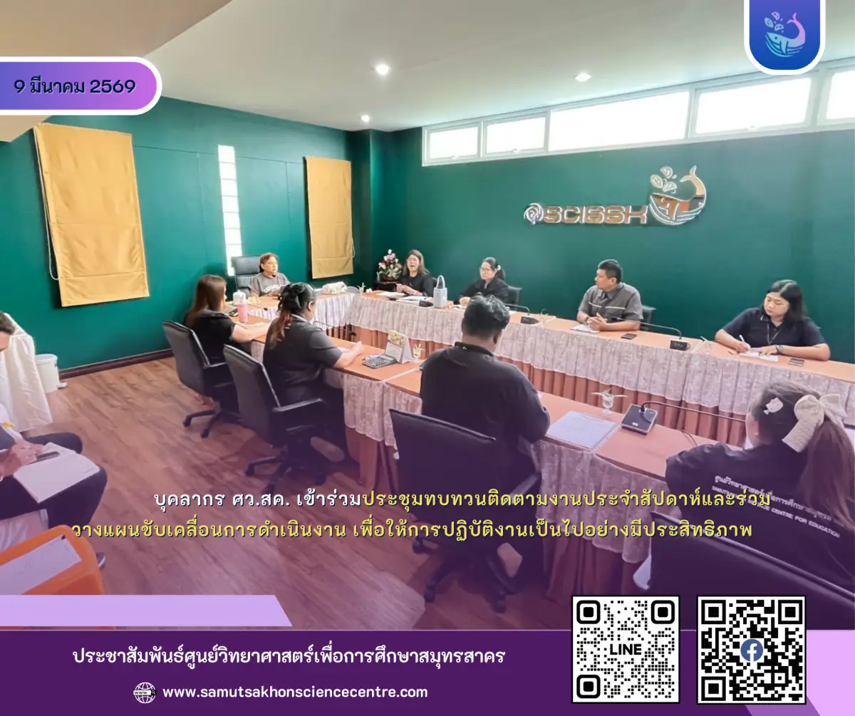บุคลากร ศว.สค. เข้าร่วมประชุมทบทวนติดตามงานประจำสัปดาห์และร่วมวางแผนขับเคลื่อนการดำเนินงาน เพื่อให้การปฏิบัติงานเป็นไปอย่างมีประสิทธิภาพ สอดคล้องกับเป้าหมายและภารกิจของหน่วยงาน ณ ห้องประชุมสัตบรรณ ศูนย์วิทยาศาสตร์เพื่อการศึกษาสมุทรสาคร