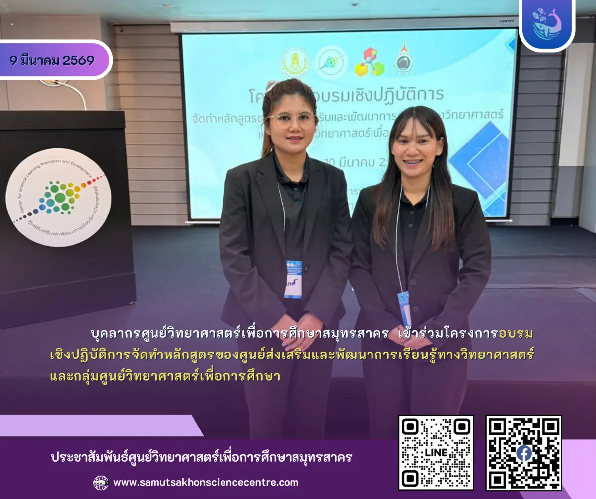ศูนย์วิทยาศาสตร์เพื่อการศึกษาสมุทรสาคร มอบหมายให้ นางสาวอิรัตน์สวดี เครือกาบ และนางสาวธนิษฐา เสนานุช พนักงานราชการ เข้าร่วมโครงการอบรมเชิงปฏิบัติการจัดทำหลักสูตรของศูนย์ส่งเสริมและพัฒนาการเรียนรู้ทางวิทยาศาสตร์ และกลุ่มศูนย์วิทยาศาสตร์เพื่อการศึกษา ณ ห้องปฏิบัติการนิวเคลียส ชั้น 7 อาคารธรรมชาติและสิ่งแวดล้อม ศูนย์ส่งเสริมและพัฒนาการเรียนรู้ทางวิทยาศาสตร์